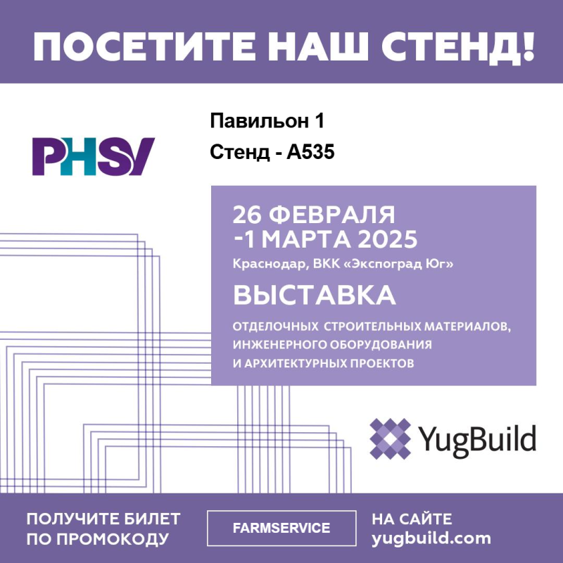 Производственный центр PHSV приглашает вас на крупнейшее событие строительной индустрии Юга России — международную выставку YugBuild! С 26 февраля по 1 марта 2025 года мы будем рады приветствовать вас на нашем стенде в выставочном комплексе «Экспоград Юг» в Краснодаре (ул. Конгрессная, 1).